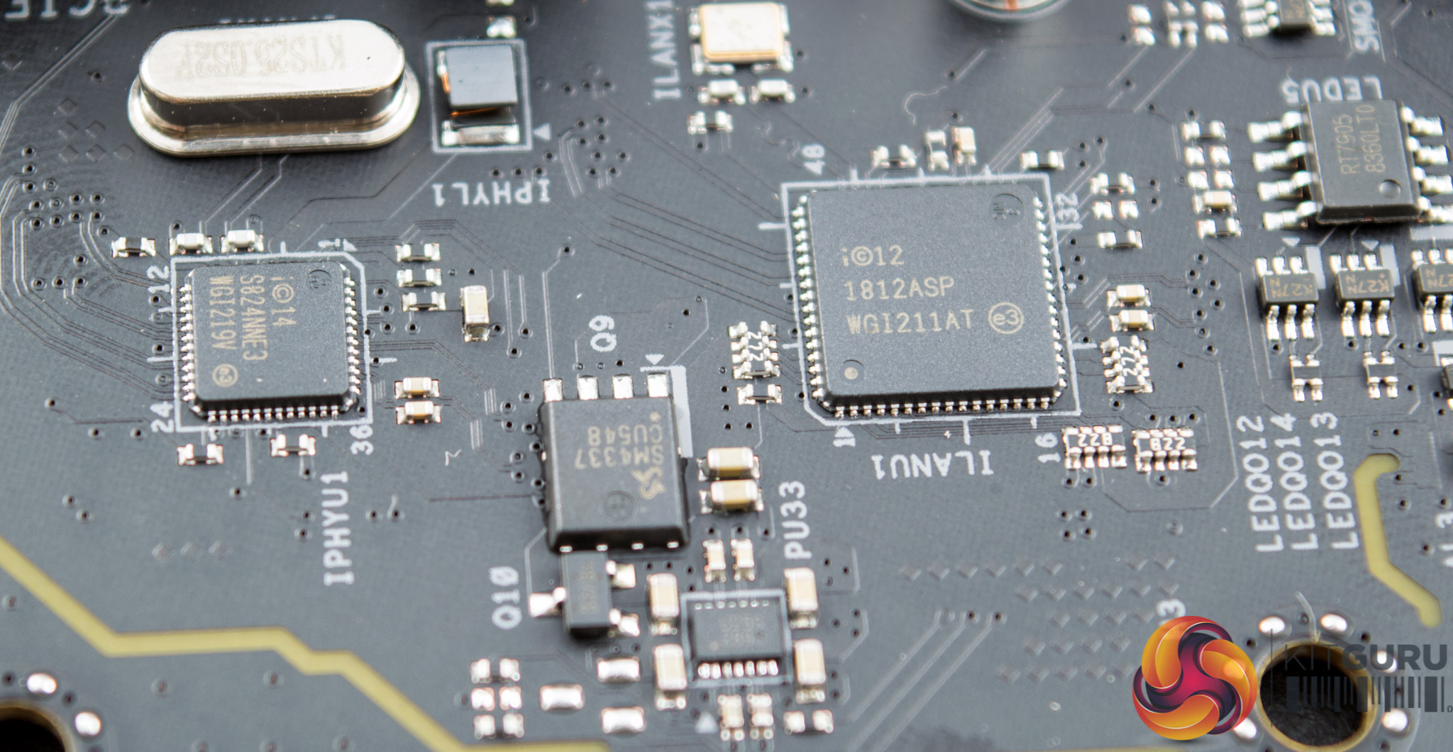 The two Intel Gigabit network controllers are found near the audio section, the larger chip is the Intel I211AT and the smaller is the I219V.
