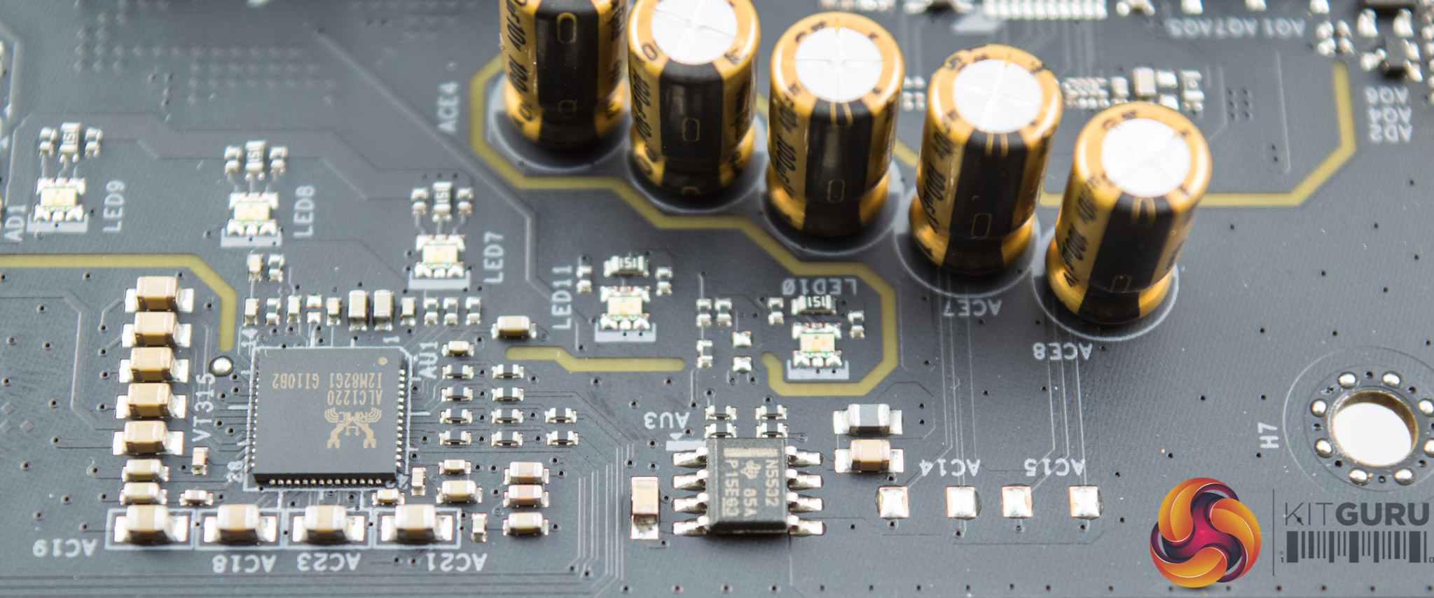 The audio hardware sits on an isolated PCB with Gold audio capacitors, a Realtek ALC1220 codec and Texas Instruments NE5532 operational amplifier.