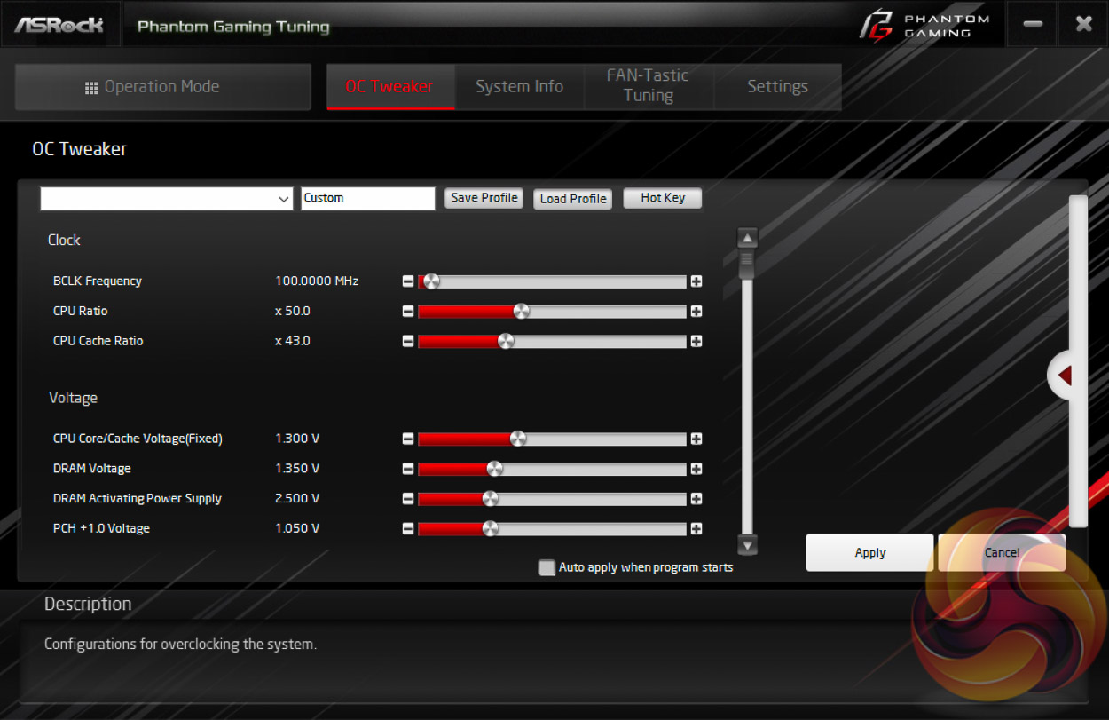 ASRock Phantom Gaming Tuning, the Phantom Gaming-branded equivalent of A-Tuning, is ASRock’s equivalent to ASUS AI Suite, Gigabyte EasyTune and MSI Command Centre. This software allows you to set power profiles, overclock on the fly (OTF) and tune the fan speeds with the ASRock Fan-Tastic tuning. It’s a reasonably well polished piece of software, is light on system resources and not very intrusive.