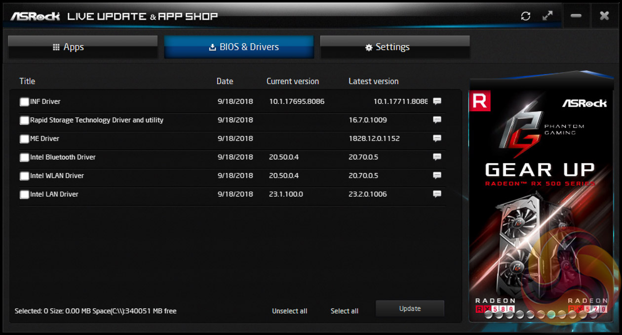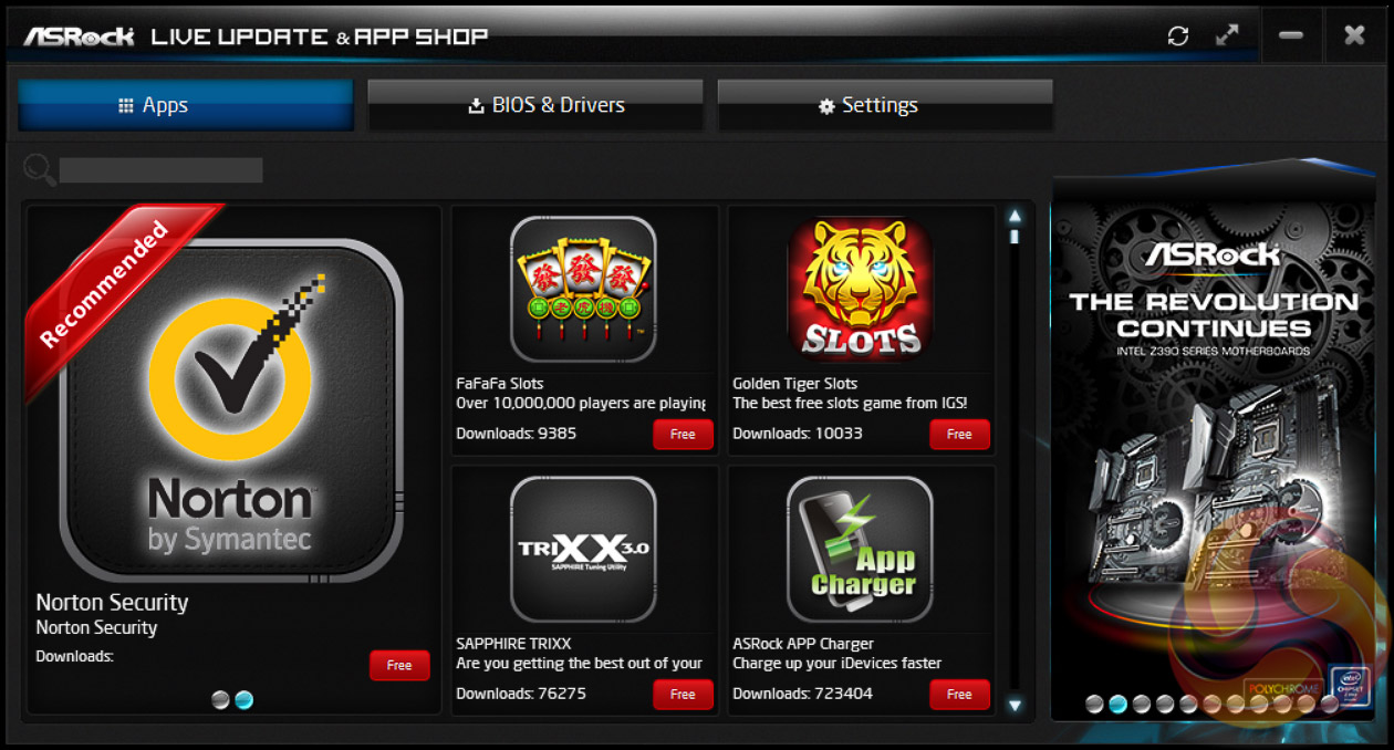 ASRock’s App Shop provides the dual role of serving out ASRock’s own software and approved third party software (some of dubious value), but also includes a MSI Live Update-style function which scans for certain BIOS and driver versions and informs the user when a newer version is available.