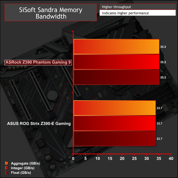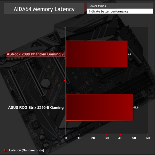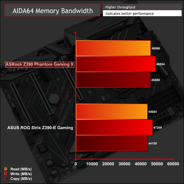 The previously mentioned CPU Turbo settings that cause the ASRock motherboard to operate the CPU faster, with higher power consumption, carry over to the memory tests too. Additionally, ASUS offered a choice of optimising memory  parameters when selecting an XMP profile, which ASRock did not.