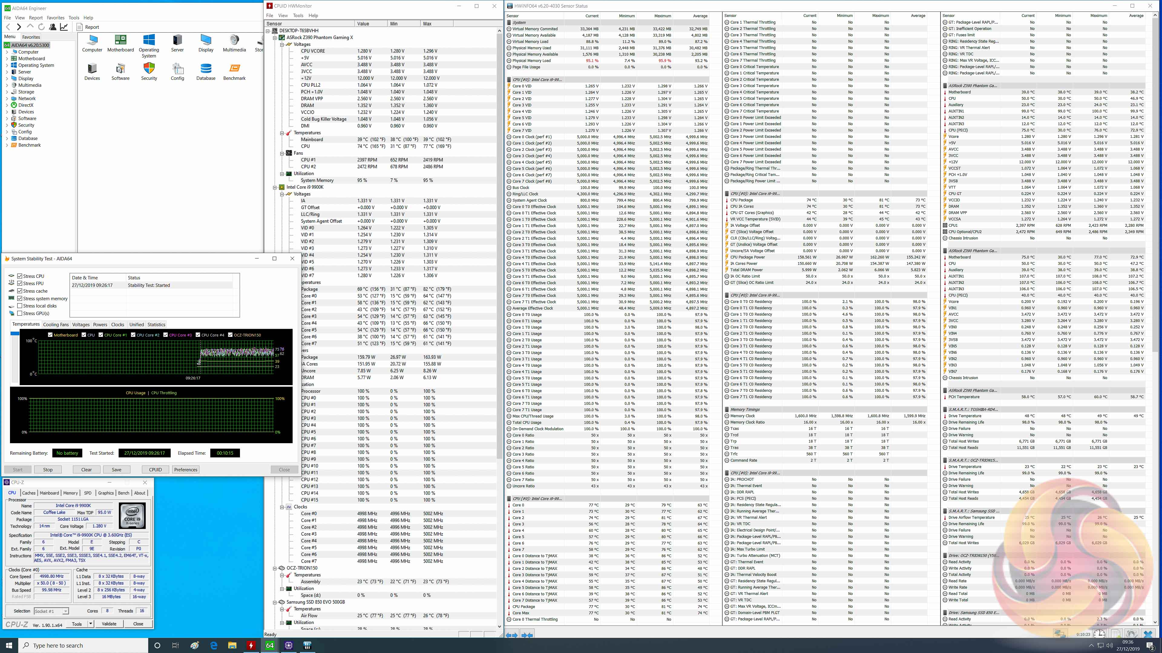 Our particular CPU is not stable at 5.1GHz even with 1.45v. The final stable overclock for almost all Z390 motherboards we may test should be 5GHz, unless there is something particularly wrong with the VRM that limits the voltage or power it can supply. In the case of the ASRock Z390 Phantom Gaming X it achieved 5GHz at 1.3 volts with no significant issues.