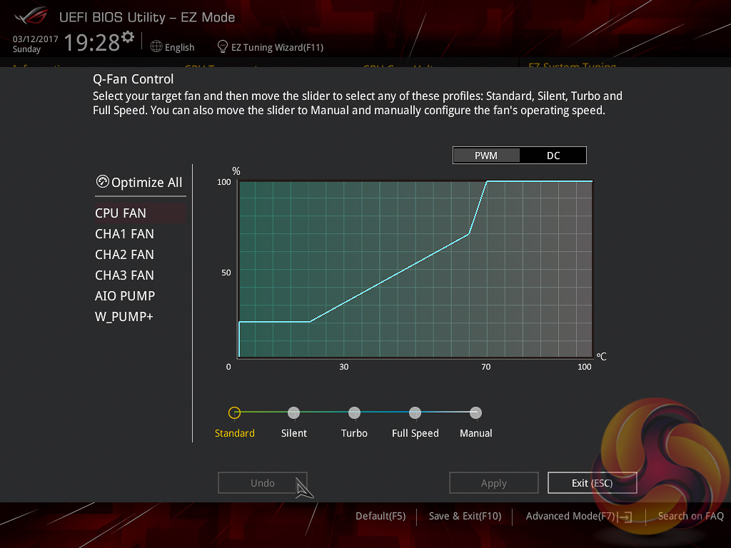 Q-Fan Control is a must-use utility since it will calculate the fan speed ranges of all PWM or DC fans on the 7 controllable fan headers (CPU, CPU_OPT, CHA1, CHA2, CHA3, AIO_PUMP, W_PUMP+). Once the voltage to fan speed values have been calculated the user can then assign a preferred profile to each fan from the four presets (standard, silent, turbo, full speed) or simply set your own using manual mode.