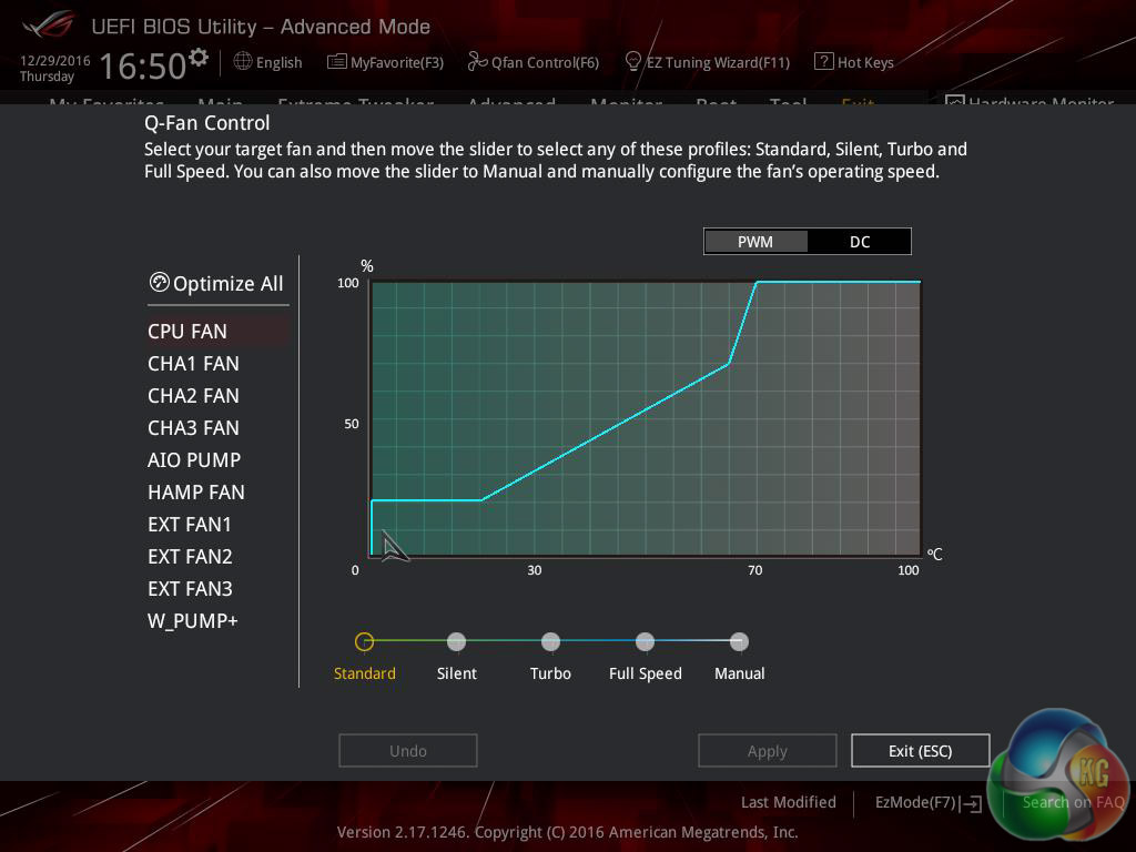 The interactive Qfan Control utility can be brought up by pressing F6 and this will auto-optimise and tune any connected fans or pumps. Fans can be controlled via PWM or DC and the fan curve can be adjusted in a number of different ways.