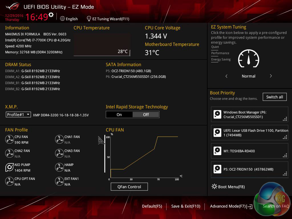 As is typical of ASUS UEFIs of recent times the default entry page is the EZ Mode splashscreen which contains the most commonly altered settings: XMP, fan speed and boot order.