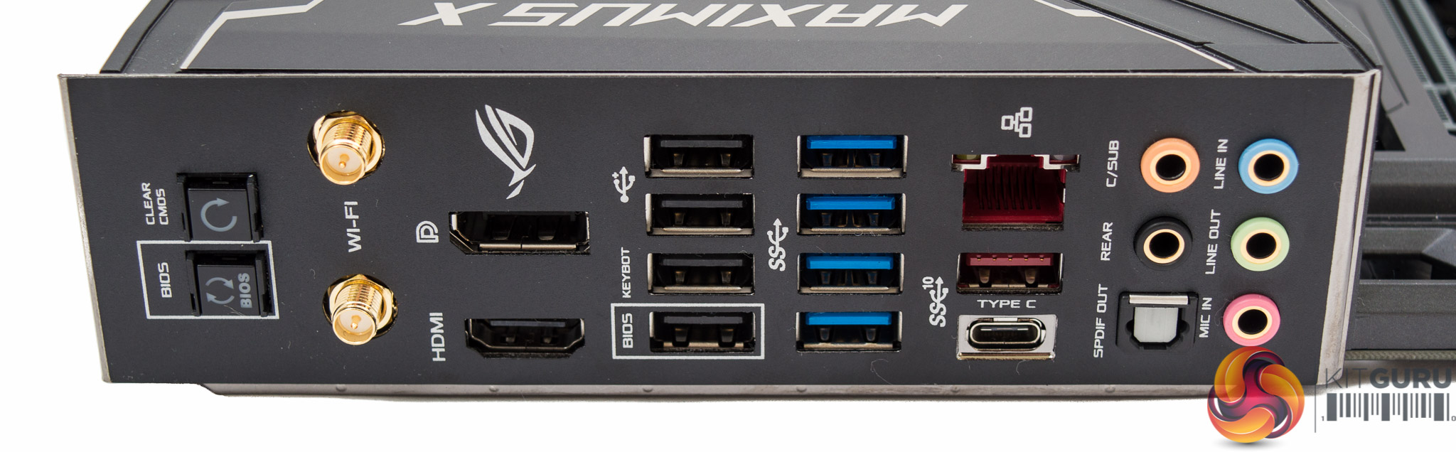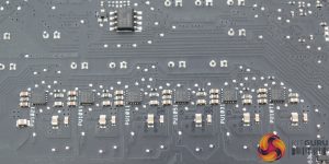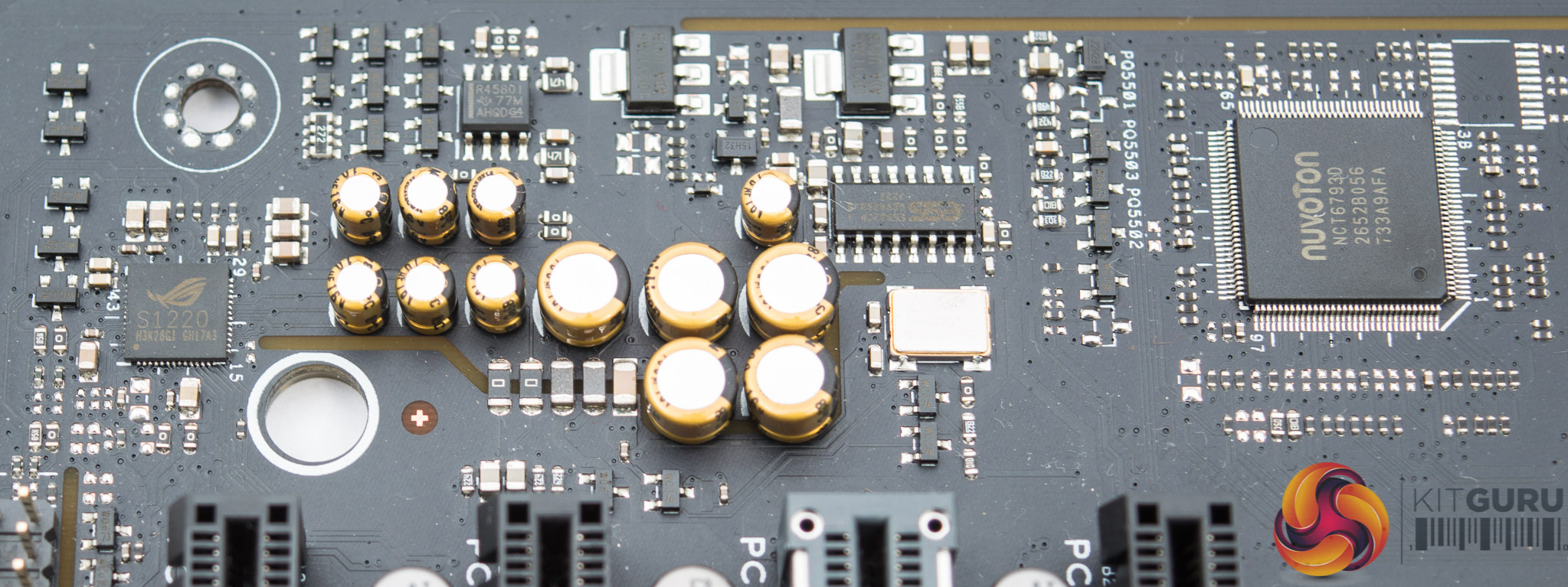 The audio components are high quality and consist of the Realtek ALC1220 codec (custom-packaged as ROG S1220), an ESS Saber DAC ES9023P, Texas Instruments RC4580 operational amplifier and Nichicon Gold Series audio capacitors. Everything sits on a separated PCB and the audio jacks are gold plated too.