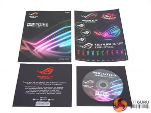 The ASUS packaging is just as congested as the motherboard itself with the company frantic to highlight all the unique features of this mini-ITX powerhouse. Some of those highlighted features include the unique M.2 and audio combination card, LED-illuminated audio jacks and AURA Sync and USB 3.1 Gen 2.
