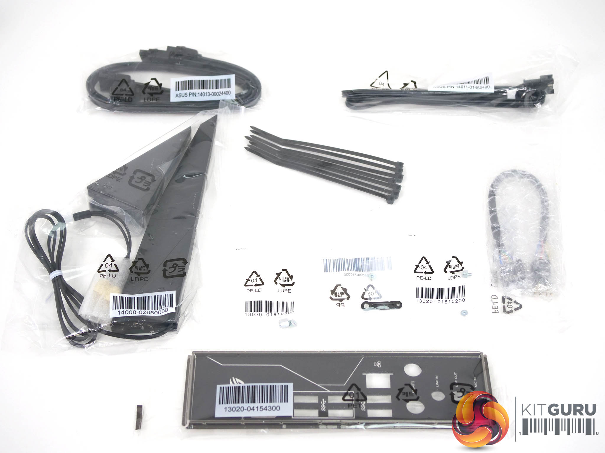 The bundle includes various bits of documentation, a driver/utility DVD, cable labels, the I/O shield, SATA cables, cable ties, a WiFi antennae, an RGB LED extension cable and various mounting screws.