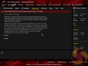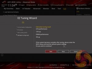 We have tried the automated ASUS overclocking utility, EZ Tuning Wizard, before and it provides your CPU and memory with a crude automatic overclock depending on which options you select and the hardware you are using. In our case it provided 3.5GHz for the Ryzen 7 2700 and our memory was left unchanged at 2133MHz JEDEC when running from optimised defaults.