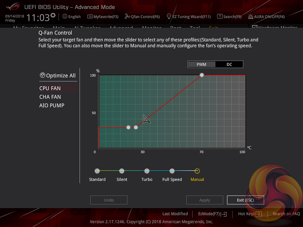 Q-Fan Control is a must-use utility since it will calculate the fan speed ranges of all PWM or DC fans on the 3 controllable fan headers. Once the voltage-to-fan-speed values have been calculated the user can then assign a preferred profile to each fan from the four presets (standard, silent, turbo, full speed) or simply set a custom profile using manual mode.
