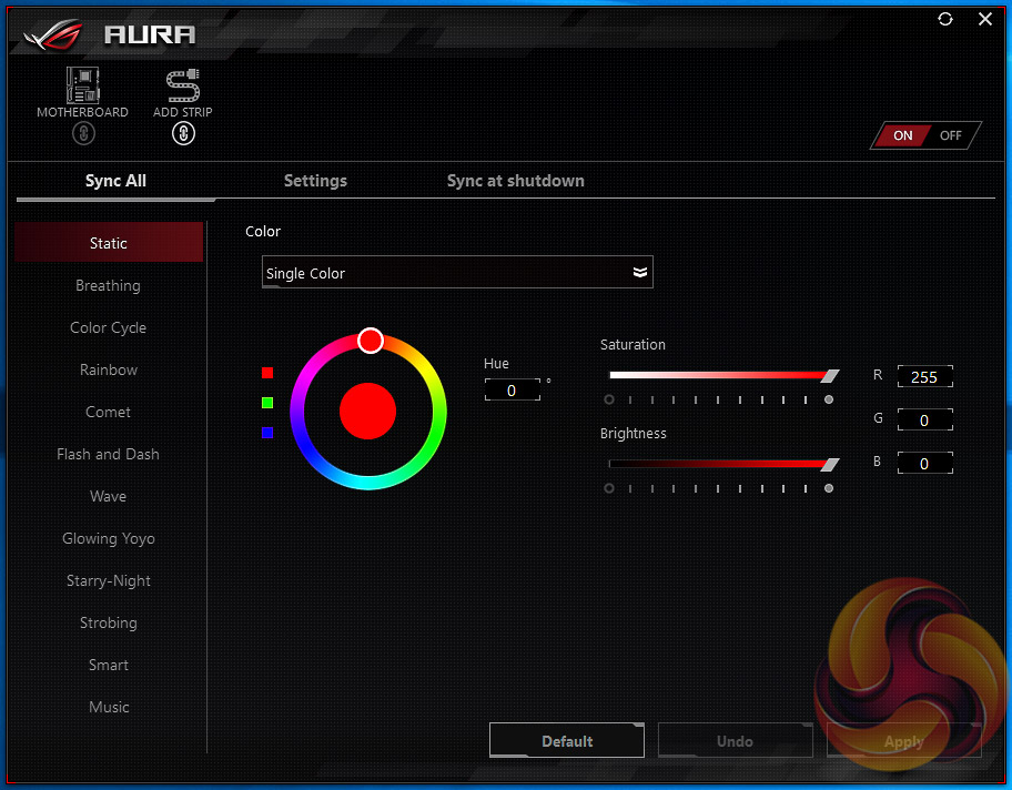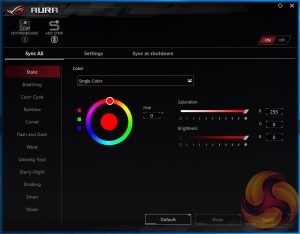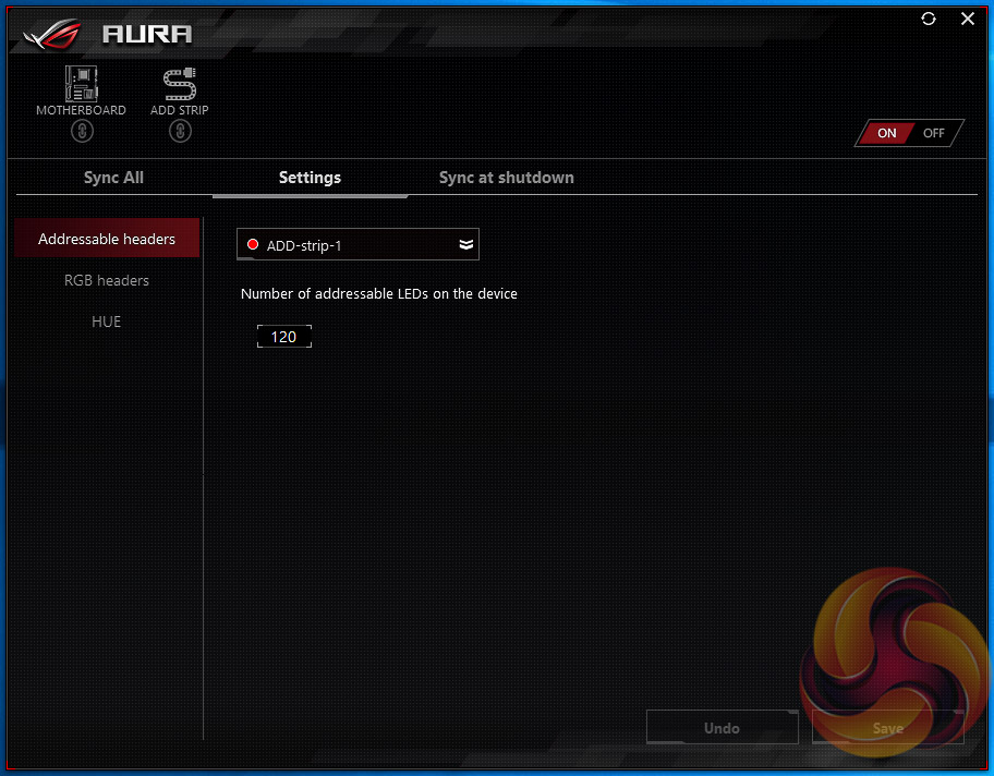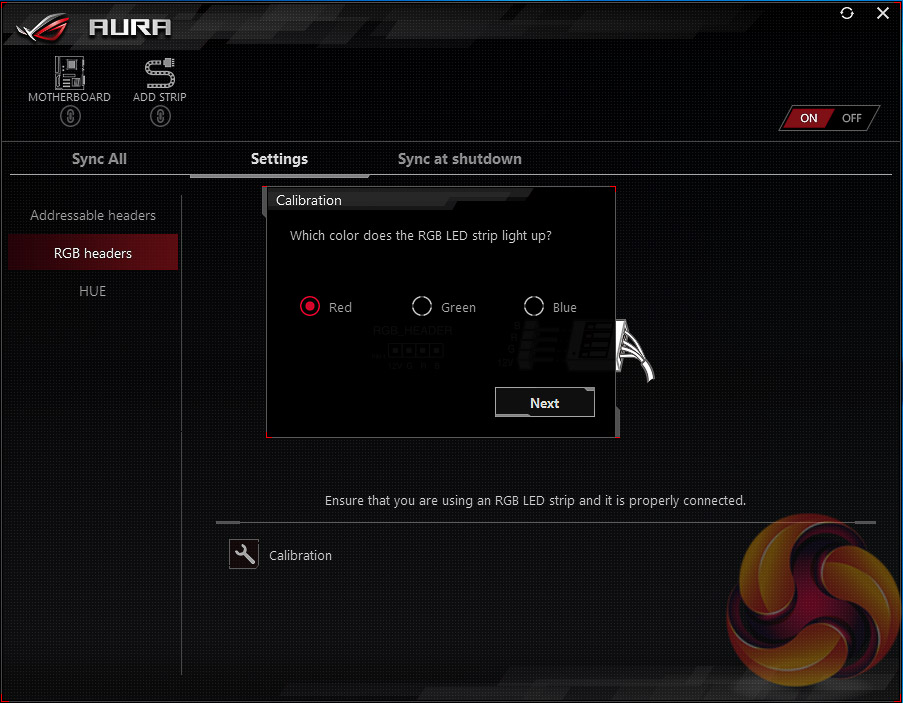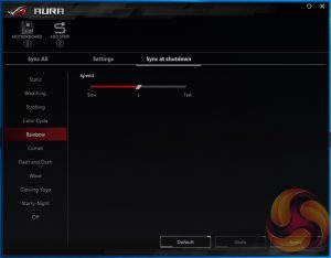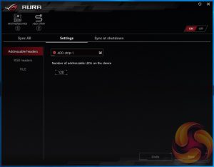 The settings tab details a few more compatibility options such as for calibrating RGB LED strips, integrating a Hue Bridge (Phillips Hue product integration) and the Sync at shutdown tab allows users to specify the “turned off” (standby power after shutdown) behaviour of the motherboard’s RGB LEDs.