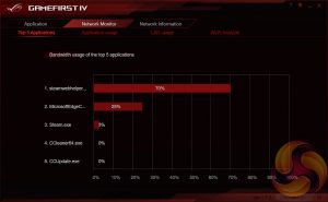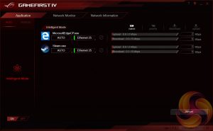 The ROG GameFirst IV software is now at version IV and is the ASUS packet prioritisation software of choice for the on-board Intel I211-AT Gigabit LAN and Realtek 8822BE WiFi. There are a variety of application profiles that can be set on a per-application basis, nominating one application as higher priority over another will allow it to use more of the total available bandwidth and have higher priority for send and receive requests.