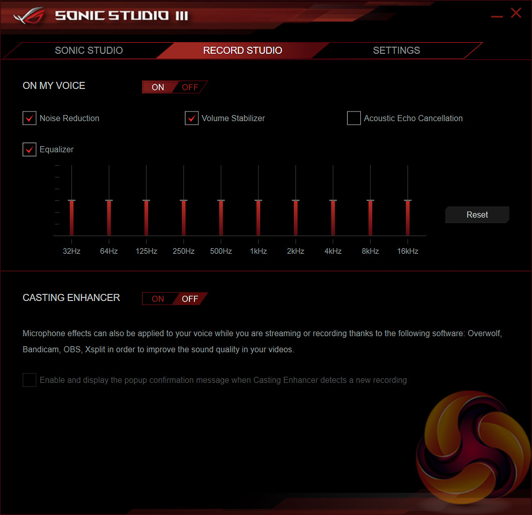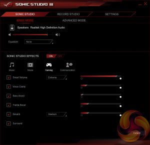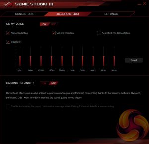 ASUS Sonic Studio III is an audio enhancement application which enables a range of different equaliser presets and HRTF-based (Head related transfer function) virtual surround for virtual reality headsets.