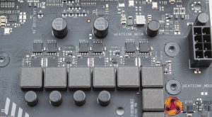 ASUS marketing materials imply the system runs an 8+2 phase VRM solution, with two phases for the iGPU and 8 phases for the CPU VCore, both doubled from a true 4+1 phase configuration. However, it isn't immediately clear how the iGPU gets two phases from only one ferrite-core choke/inductor and three MOSFETs when all other phases use 1 choke and 2 MOSFETs per phase.
