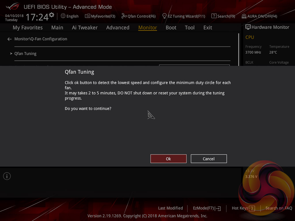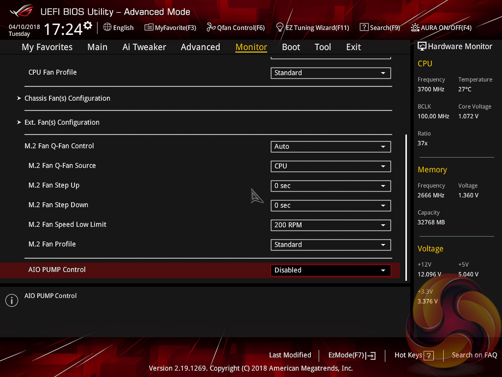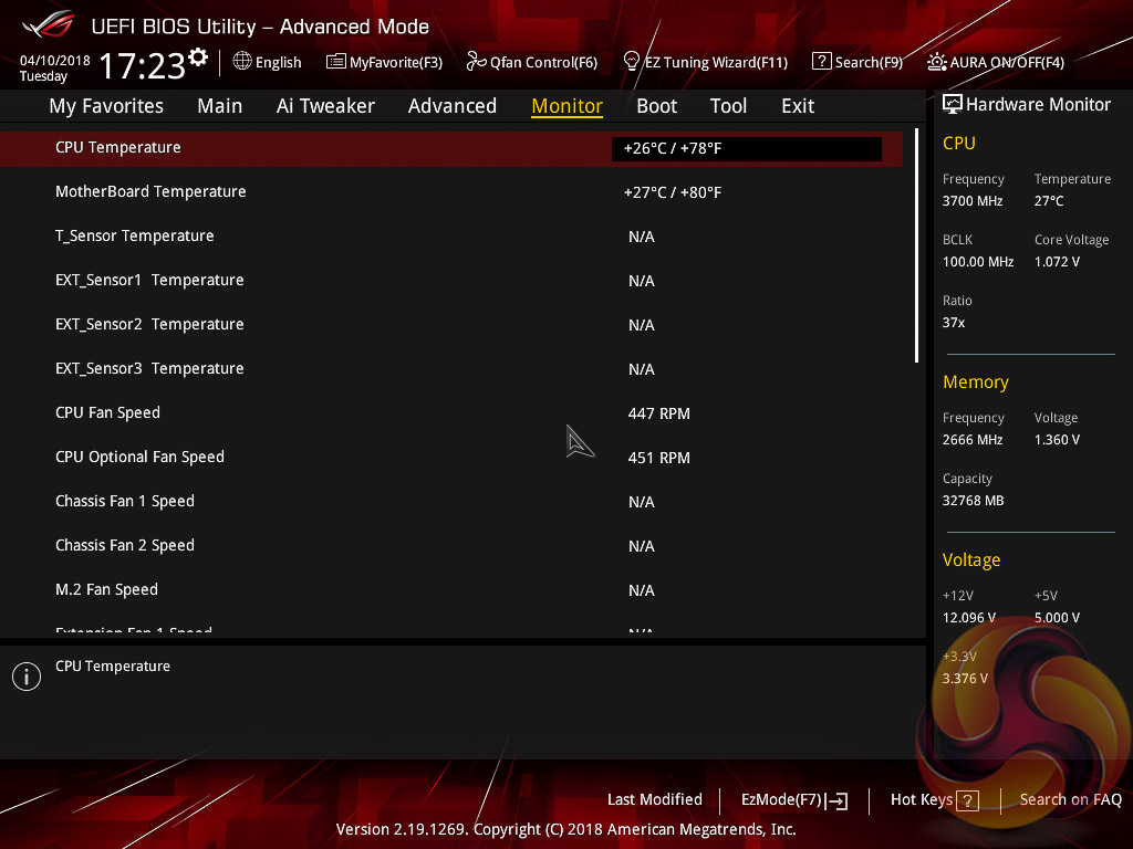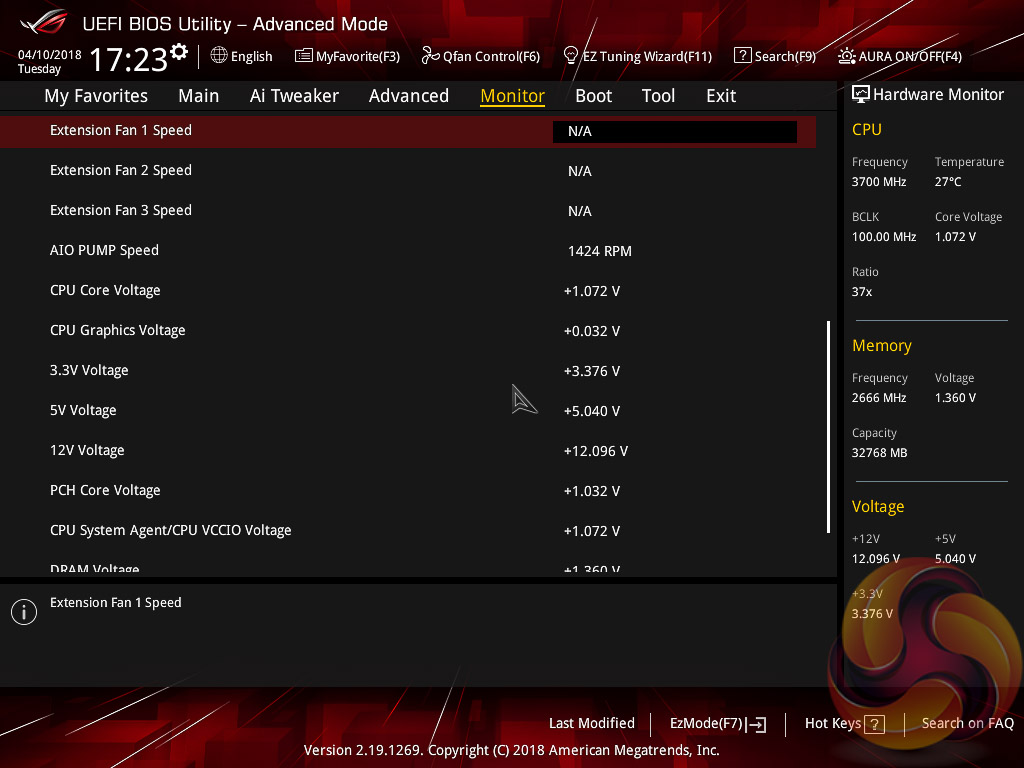 The Monitor tab will allow you to instruct the UEFI how to handle temperature data from the various sensors as well how to control fan speed profiles. For example, where a fan speed profile is temperature dependant you can choose which temperature sensor to use. If you purchase the optional ASUS Fan Extension card that can also be configured from within this section.