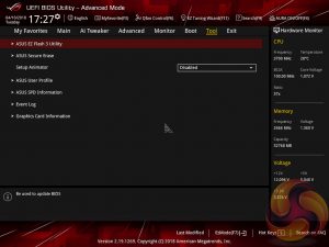 The ASUS UEFI opens onto the EZ Mode splash screen which has a selection of frequently used settings including XMP profiles, boot device order and fan speeds. Pressing F7 takes the user into the advanced section of the UEFI, but there are some additional tools that can be accessed from the splash screen such as Q-Fan Control and EZ System Tuning.