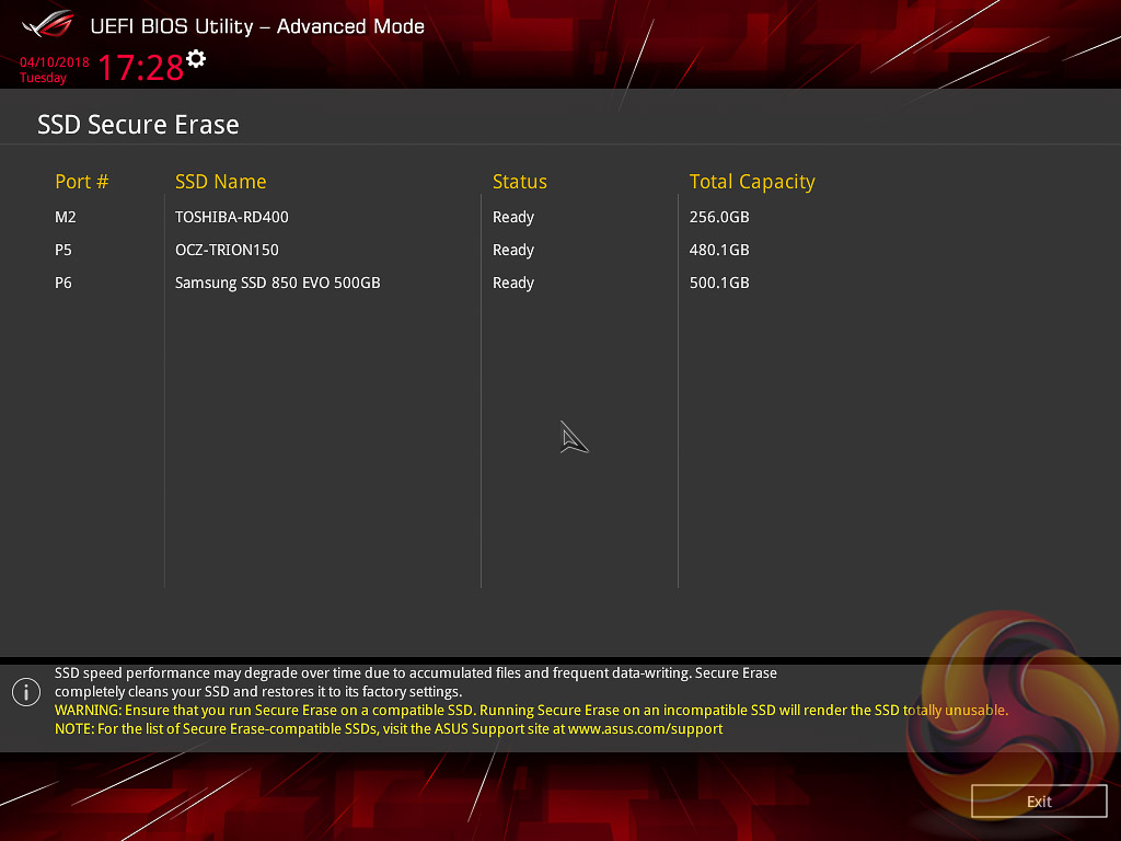 ASUS SSD Secure Erase is a UEFI-based tool to completely wipe a compatible SSD and return it to factory settings. It does, however, come with an ominous warning that “Running Secure Erase on an incompatible SSD will render the SSD totally unusable”, enough to scare most people away. ASUS does provide a compatibility list online, though.