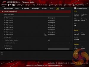 ASUS User Profile, called ASUS Overclocking Profile on Z370, allows UEFI settings to be saved to a file or to UEFI memory so they can be reloaded later or shared with other users.