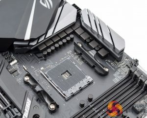 The design of the ASUS ROG Strix X470-F Gaming is mostly subtle with a sleek black design though the “artistic” application of text on the heatsink and printed on the PCB may polarise consumers. The plastic shroud over the rear I/O area continues to be a recurring trend on ASUS ROG motherboards since it tidies up the overall aesthetic and allows for a more creative implementation of RGB LEDs filtered through the ROG logo.