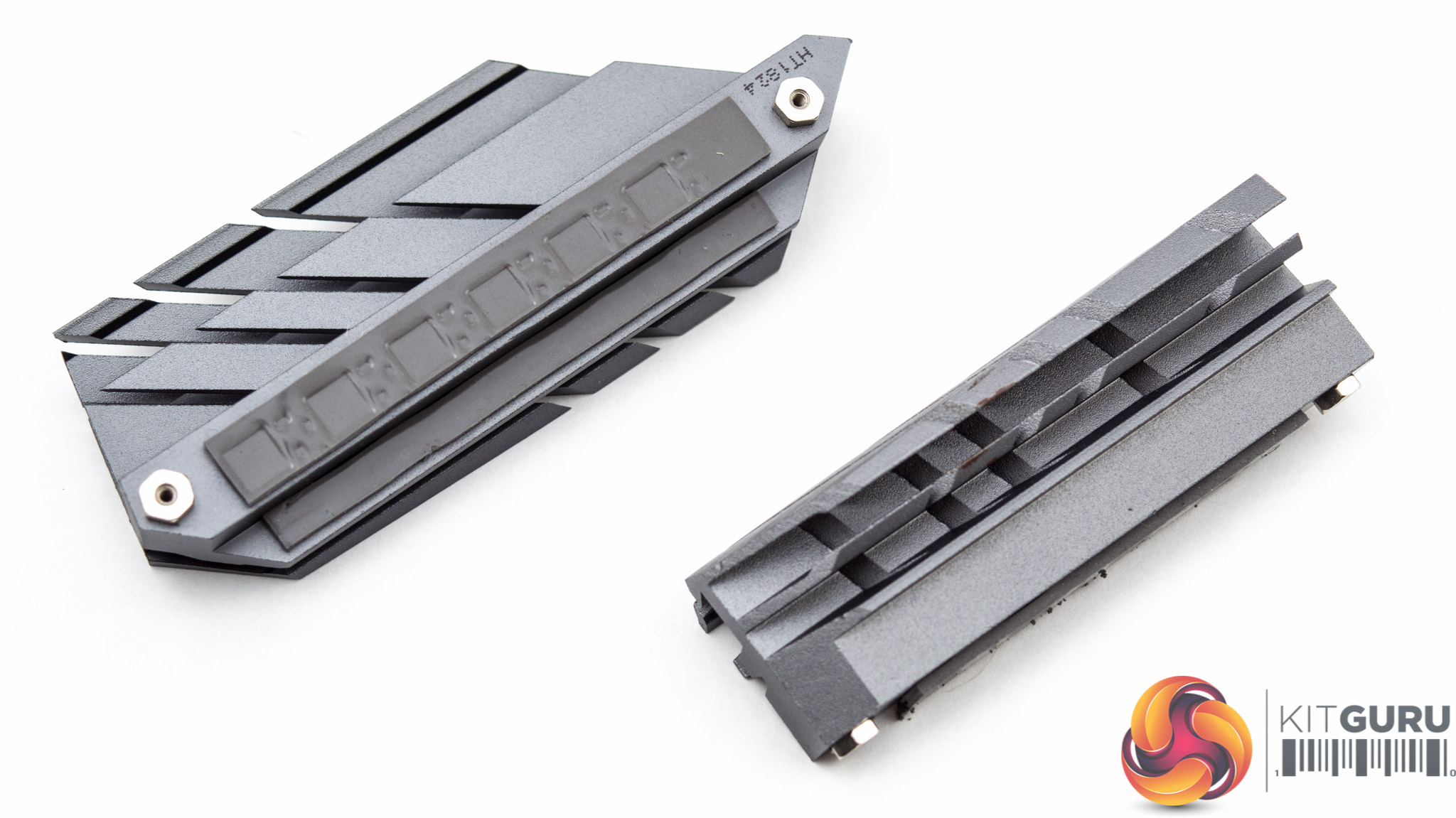 The primary M.2 slot, with 32Gbps of PCIe 3.0 x4 bandwidth, is located beneath a significant heatsink assembly. A quick dissection reveals this is formed of three constituent pieces, one for the PCH, one for the M.2 slot and then a third piece which links the two together.