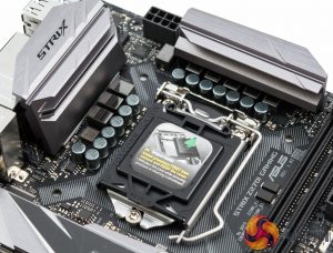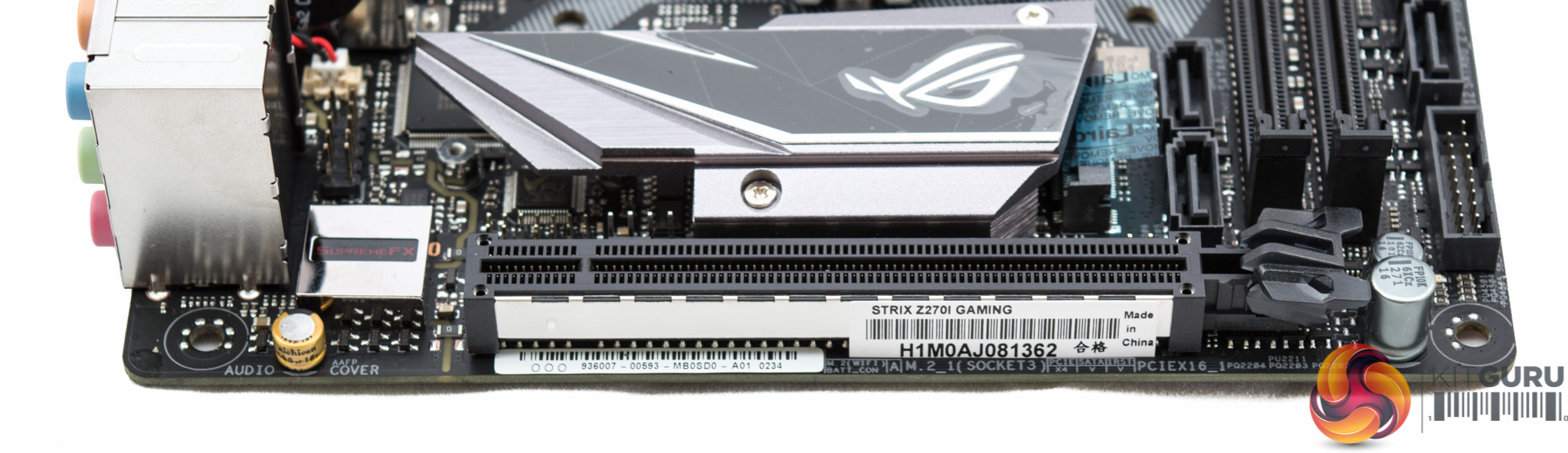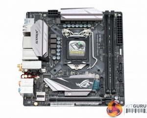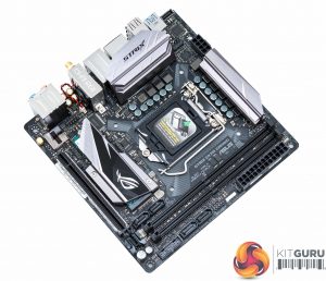 ASUS has always excelled with the aesthetics of its motherboards and the ROG Strix Z270i Gaming does not disrupt that trend. There are two VRM heatsinks with sharp angular designs plus another quirky looking chipset heatsink, the so called “double-decker” design. The whole colour scheme is neutral, focusing on black and grey, which works well with the ASUS AURA RGB lighting system.