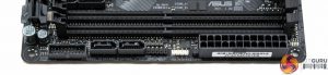 The layout is complex and busy, but well thought out. Along the 24pin-side ASUS provides debug LEDs, a 12v G R B header, front panel connections, two SATA ports and a USB 3.0 header. Near the chipset you'll find two more SATA ports and a shielded PCIe slot, the ASUS SafeSlot.