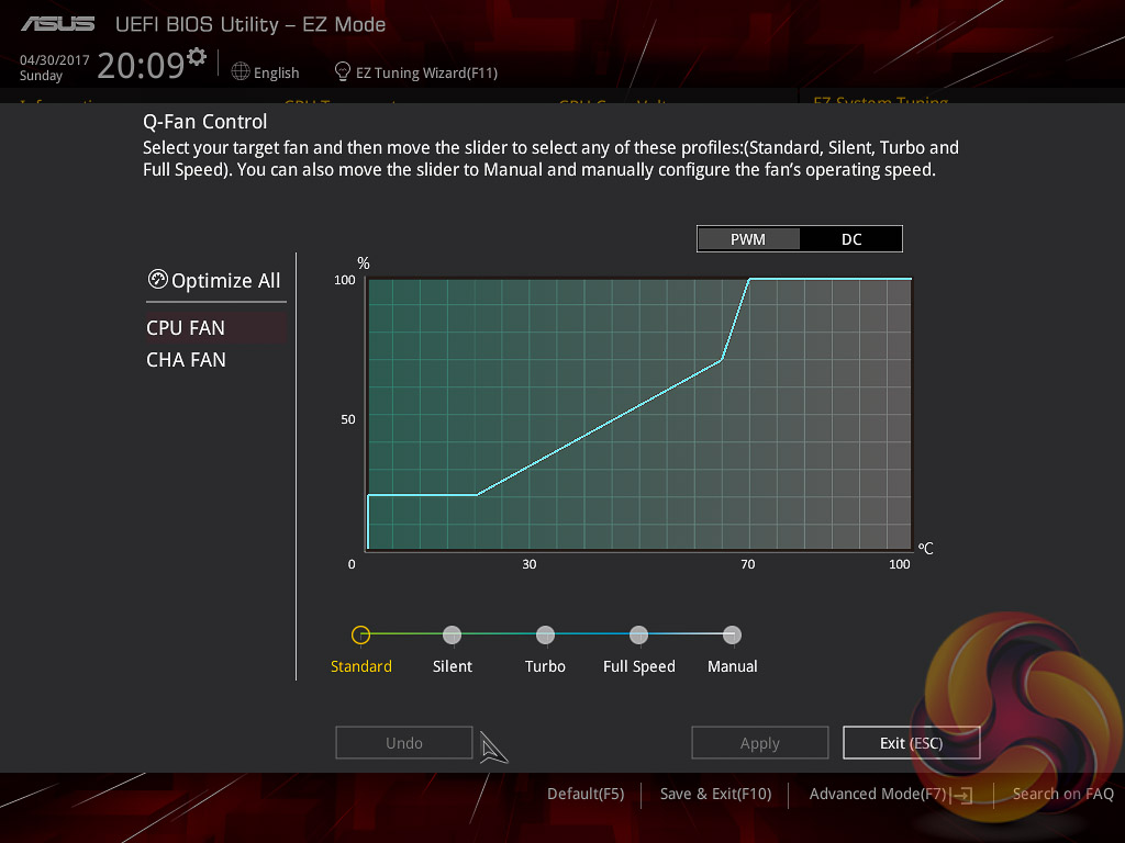 Q-Fan Control is a must-use utility since it will calculate the fan speed ranges of all PWM or DC fans on the 3 controllable fan headers (CPU, CHA1, AIO_PUMP). Once the voltage-to-fan-speed values have been calculated the user can then assign a preferred profile to each fan from the four presets (standard, silent, turbo, full speed) or simply set a custom profile using manual mode.