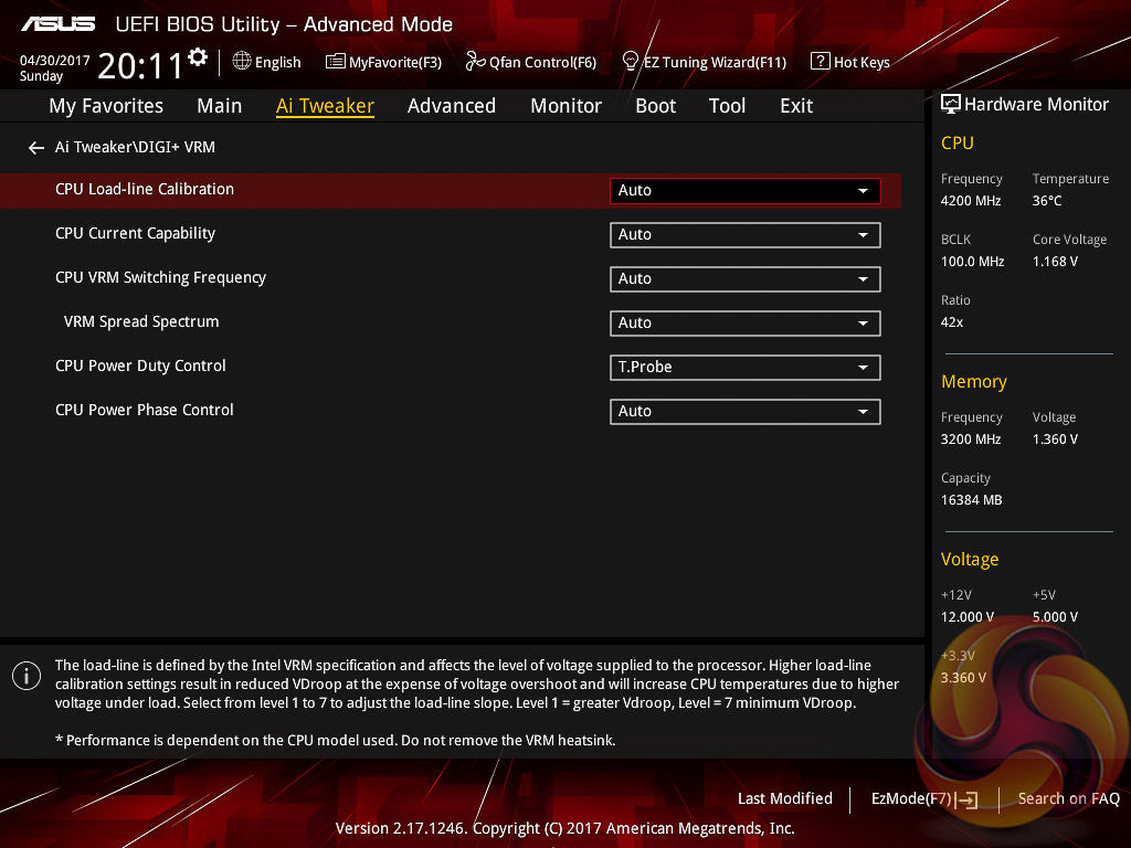 AI Tweaker is the UEFI tab which contains the vast majority of performance tuning settings pertaining to the CPU and DRAM. From here you can set XMP profiles, overclock the CPU, set all the various voltages and voltage operation modes, change the Load Line Calibration and considerably more.