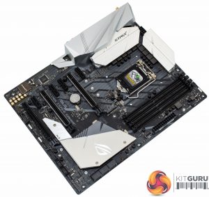 The aesthetic design for the ROG Strix Z370-E Gaming is black with silver-metallic accenting on the heatsinks and rear I/O shield, compare that to the Z270-E which was black and dark-grey. ASUS implements are rather unique shading and hatching effect onto the PCB which is unusual and certainly adds a certain something to the design and presentation.
