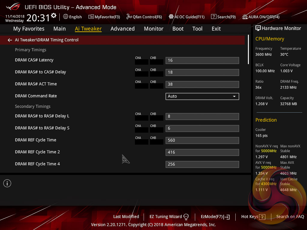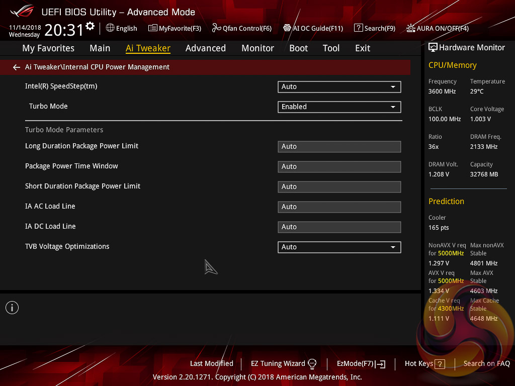 ASUS claims they have developed a “proprietary algorithm” which tests the quality of the CPU and mixes that with the capability of the CPU cooler to give a better result. When we enabled this using “100” optimism after calibrating our CPU cooler we got a 166 points score for the CPU cooler, with a “4.8GHz” turbo mode for non-AVX workloads and 4.6GHz with AVX and 4.65GHz cache. The light load result was 5GHz while the heavy load result was 4.8GHz, all using 1.204~1.257v (non-AVX/AVX) for the CPU and 1.1v for the Cache.
