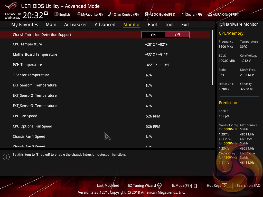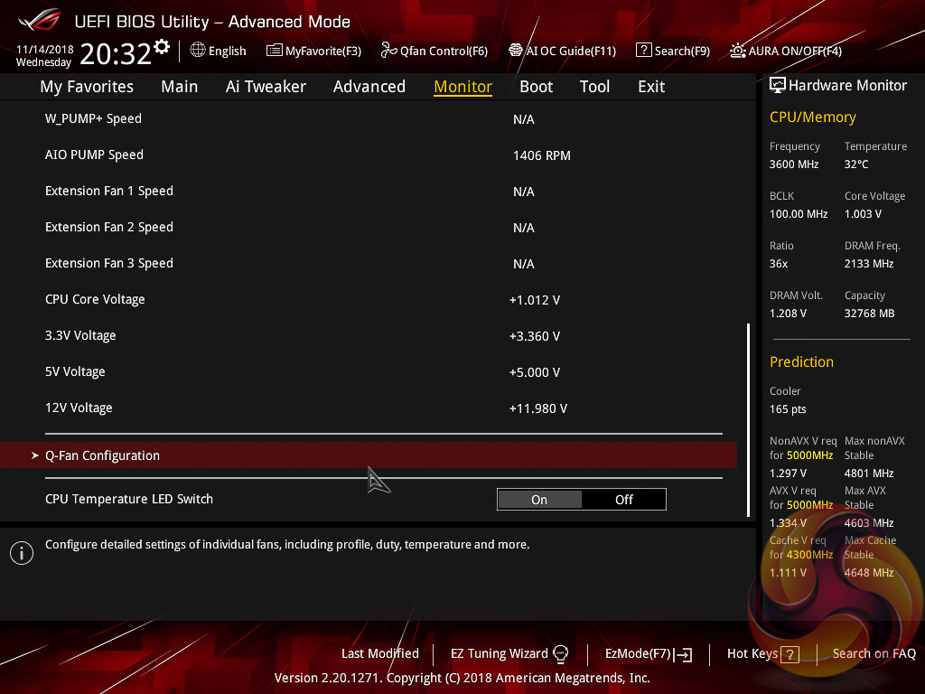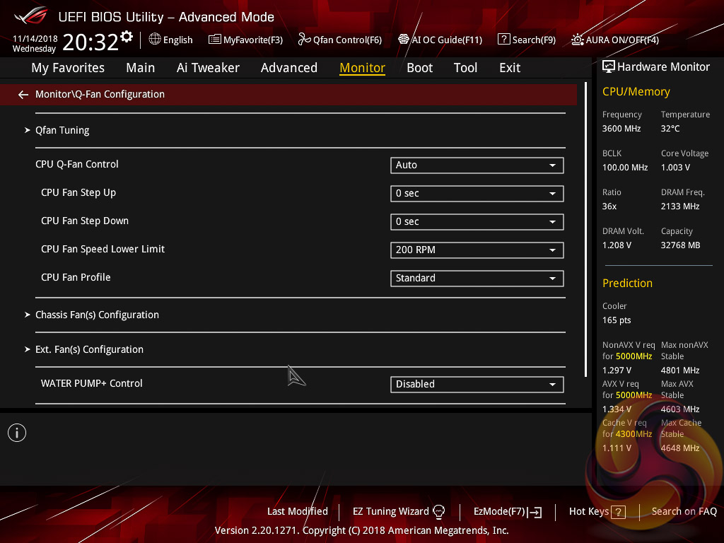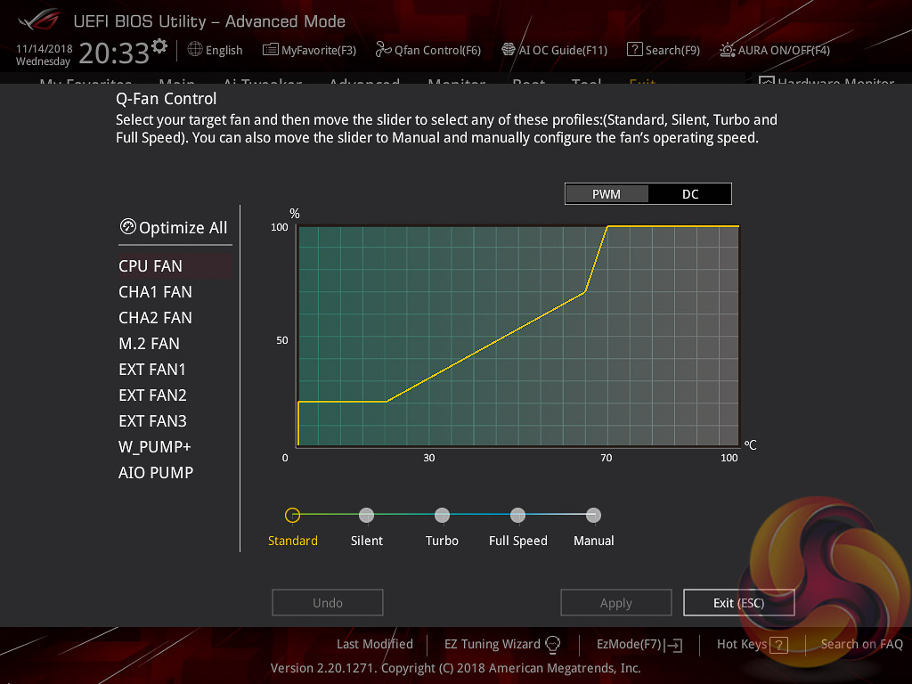 The Monitor tab will allow you to instruct the UEFI how to handle temperature data from the various sensors as well as what to do with fan speed profiles. For example where a fan speed profile is temperature dependent you can choose which temperature sensor to use. If you purchase the optional ASUS Fan Extension card that can also be configured from within this section.
