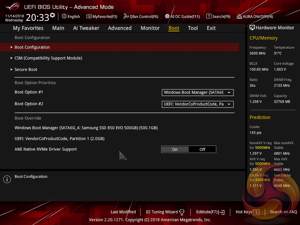 The ASUS UEFI enters straight into the EZ Mode splash screen which has a selection of frequently used settings including XMP profiles, boot device order and fan speeds. Pressing F7 takes the user into the advanced section of the UEFI but there are some additional tools that can be accessed from the splash screen such as Q-Fan Control, EZ System Tuning and AI Overclocking.