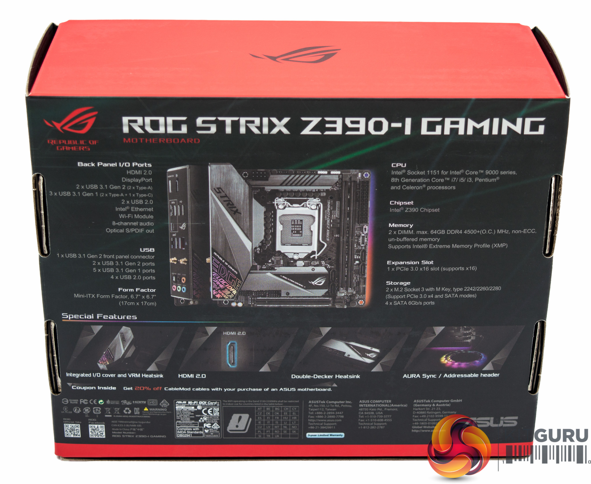 Compact packaging for a compact product, the box highlights the “doubler decker” chipset and M.2 heatsink, as well as the integrated I/O cover and VRM heatsink design. To finish off the design elements ASUS offers “AURA Sync” with onboard lighting and both 12v G R B and 5v Digital addressable headers.