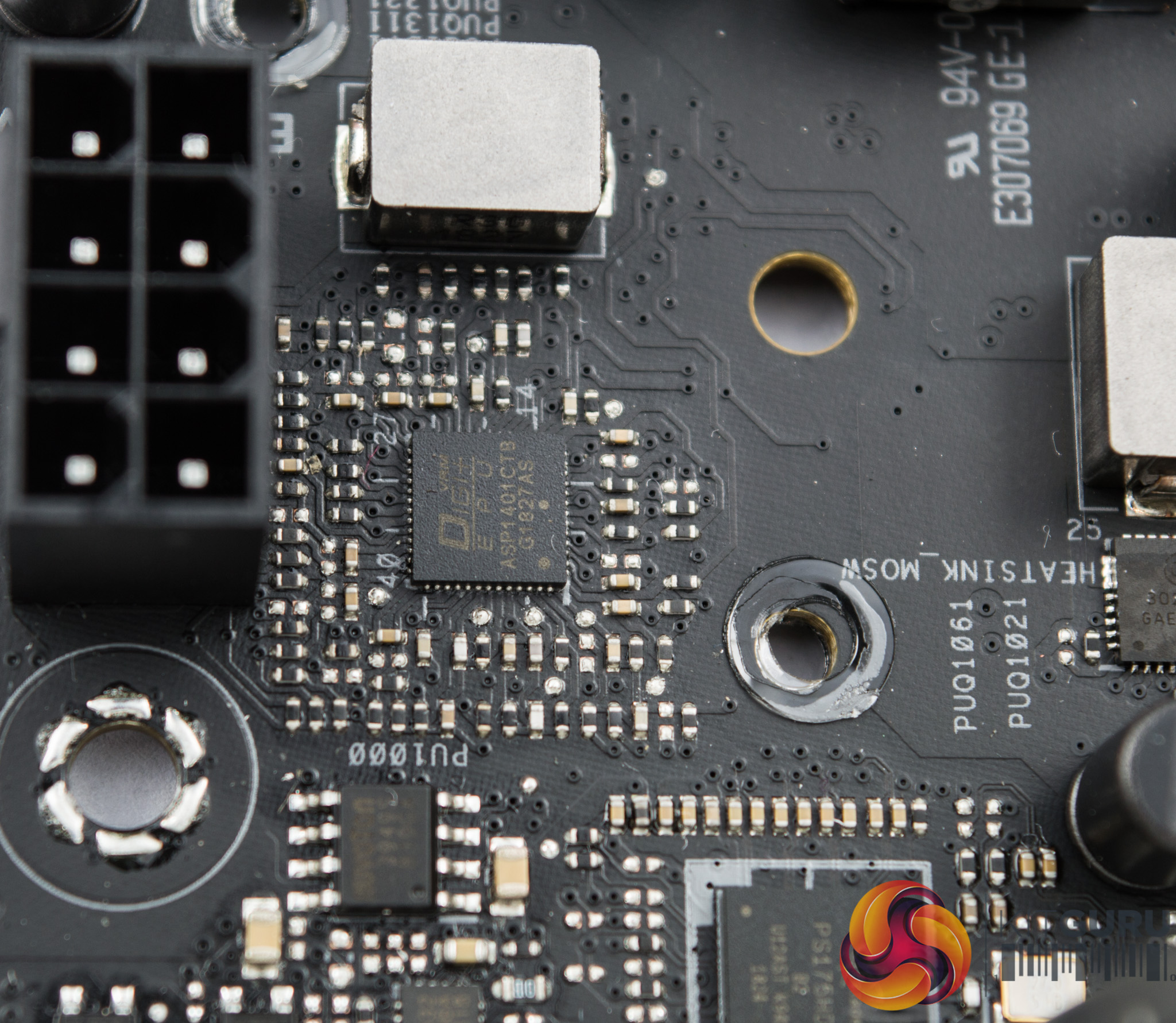 The PWM controller is marked ASP1401CTB and is thought to be a unit capable of up to 4+2 phases, but in this configuration it is likely operating as 3+2 phase.