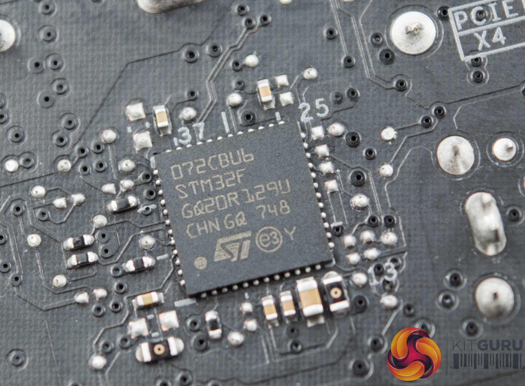 An STMicroelectronics STM32F 072CBU6 ARM microcontroller is located on the back, though we're not sure what it is in charge of controlling.