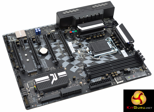 The Racing Z170 GT7 doesn't skimp on connectivity either with the usual interfaces consumers have come to expect from Z170 – M.2 NVMe, USB 3.1 Type C and SATA Express as well as USB 3.0, Gigabit LAN and SATA III 6 Gbps. PCIe lanes are arranged to support 2-Way SLI or 3-Way CrossFireX with dual-slot spacing. Two of the 16X lanes run at 4X and are provided through the chipset (South Bridge), not by the CPU, so 3-Way and 4-Way SLI is not an option, neither is 4-Way CrossFireX.