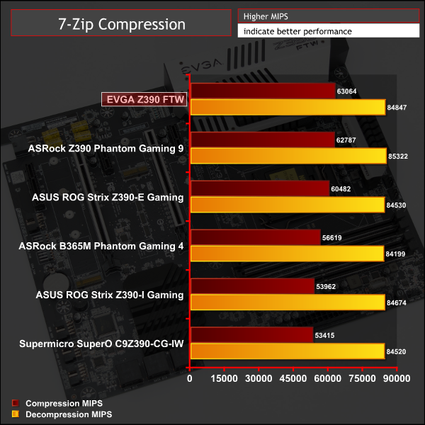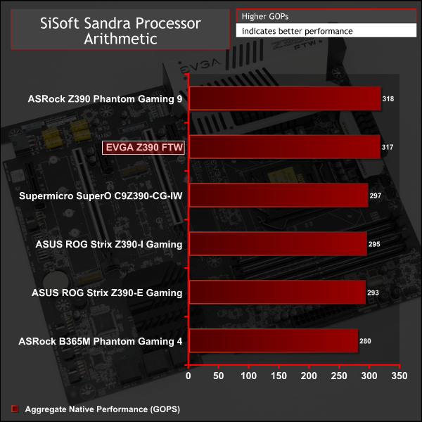 EVGA has tweaked the Turbo settings to ensure the CPU perpetually runs at maximum Turbo frequency, 4.6~4.7GHz (depending on the workload), at the expense of power consumption. In shorter benchmarks, like 7Zip and Cinebench, it isn’t so noticeable because even CPUs following Intel's default Turbo specifications will ramp up to 4.7GHz for a short while (about 32 seconds) but in longer tests, such as SiSoft Sandra 2018 Processor Arithmetic, it is obvious which motherboards extend that Turbo duration indefinitely.