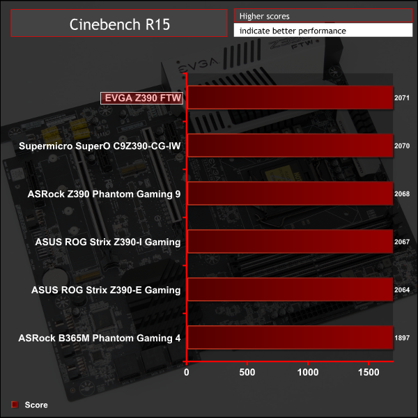 CPU performance is variable between the motherboards which respect Intel's Turbo Specifications and those that do not (the ASRock Z390 Phantom Gaming 9 and EVGA Z390 FTW).