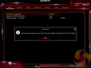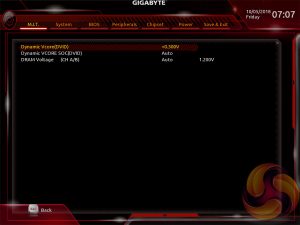 Gigabyte permits only a positive offset for the VCore voltage of +0.204v, given the base value is 1.0v the maximum final achievable voltage is about 1.2v. With a 1.2v limit we were only able to achieve 3.9GHz, 0.2GHz lower than normal. This restriction was present with both F1 and F2 revisions of the UEFI.