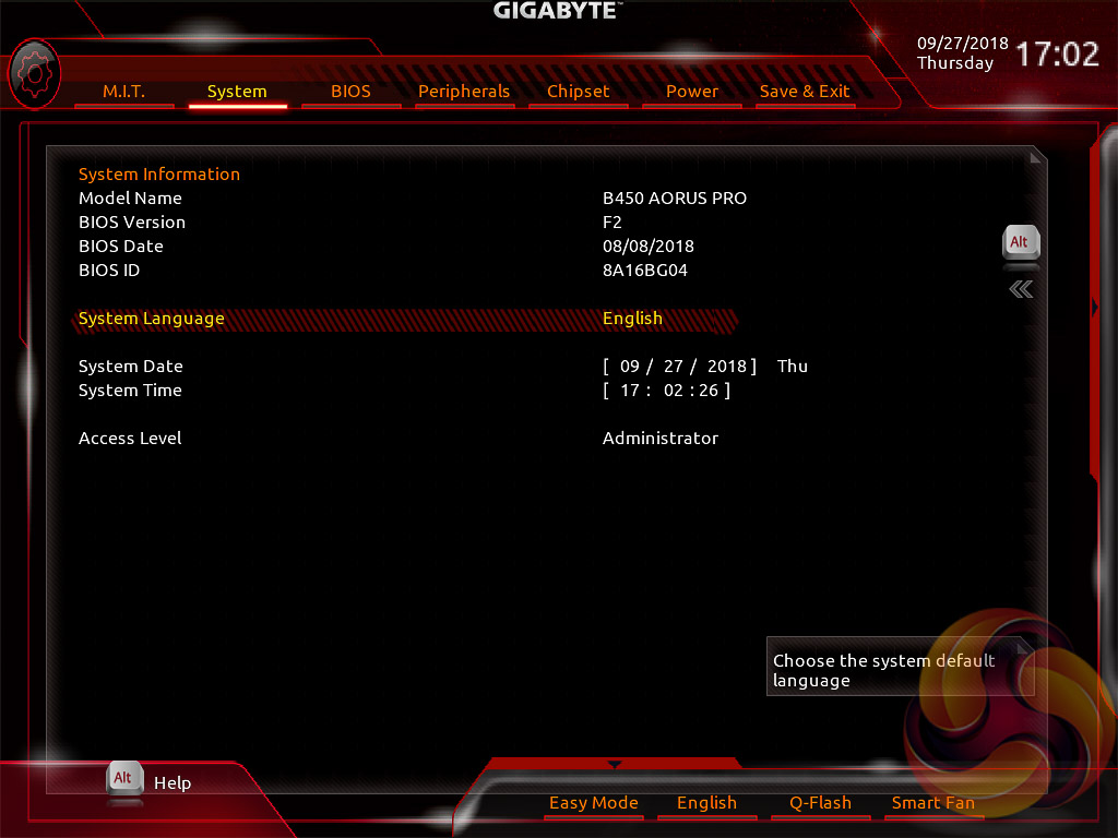 System tab contains only BIOS version information, language, time and date settings.