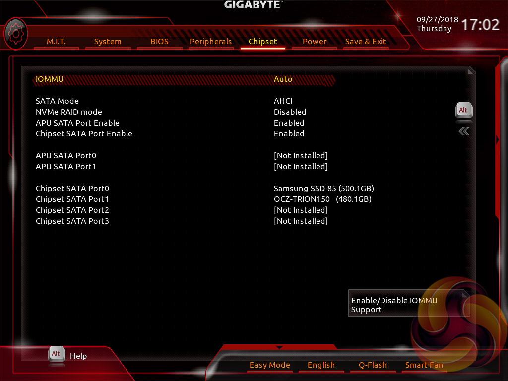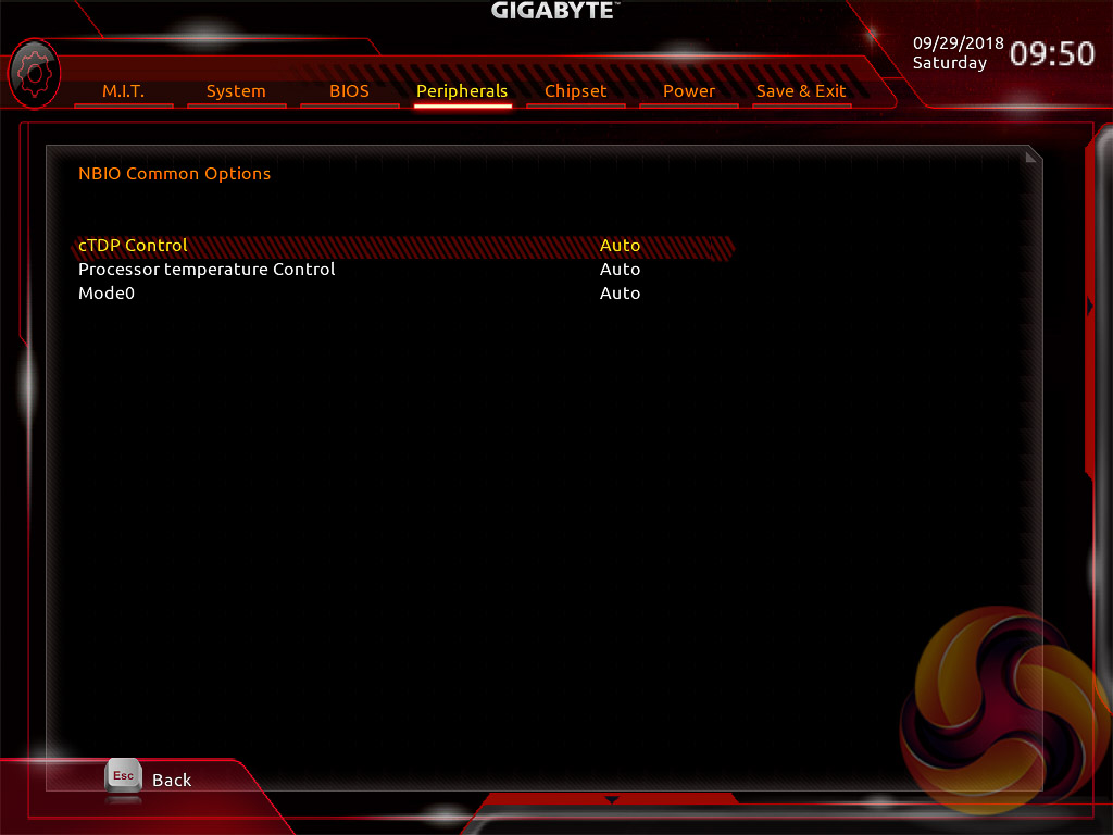 Peripherals and Chipset tabs contain all options pertaining to other hardware on the motherboard that isn’t the CPU or DRAM. USB, NVMe, LAN, Audio, SATA and a number of miscellaneous troubleshooting and compatibility settings are found in these two tabs.