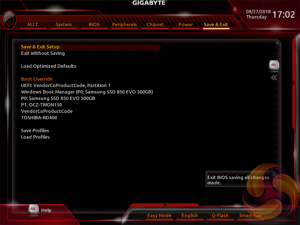 The Power tab has some obscure power settings that might be better integrated into one of the other sections. Save and Exit contains boot override settings, which should probably be integrated into the BIOS tab, and the load and save function for BIOS settings.
