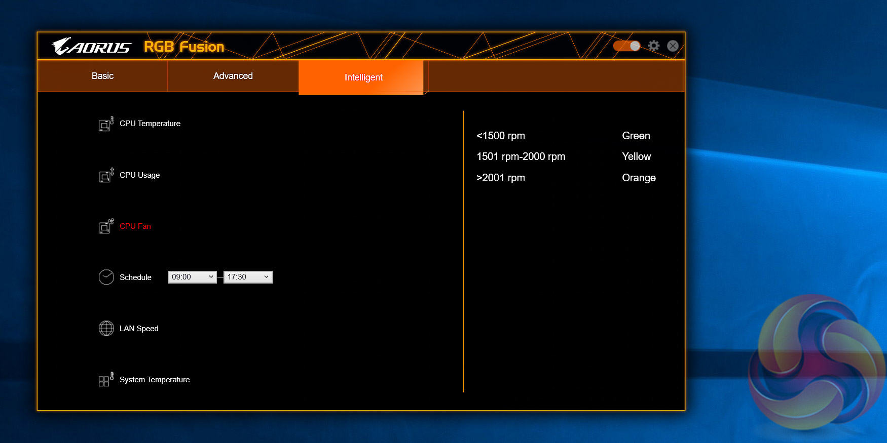 Intelligent is a mode Gigabyte has added since the Intel Z270 launch that changes colour based on a number of system parameters such as fan speeds, CPU temperatures or even LAN speed.