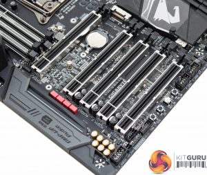PCIe connectivity is handled by five full physical size PCIe 3.0 X16 lanes. The actual electrical wiring from left to right (CPU socket to power/reset buttons) is X16/X4/X16/X4/X8 and the real operating link speeds depend on whether the CPU used is 16-, 28- or 44-lane capable.
