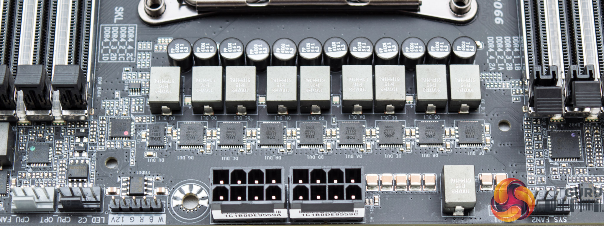 It seems the non-VCore phases around the memory and CPU socket are driven by the three IR 35204 controllers. In theory there is the capability to drive another 12 phases (three lots of 3+1) with those controllers but that number doesn't appear to be fully utilised.