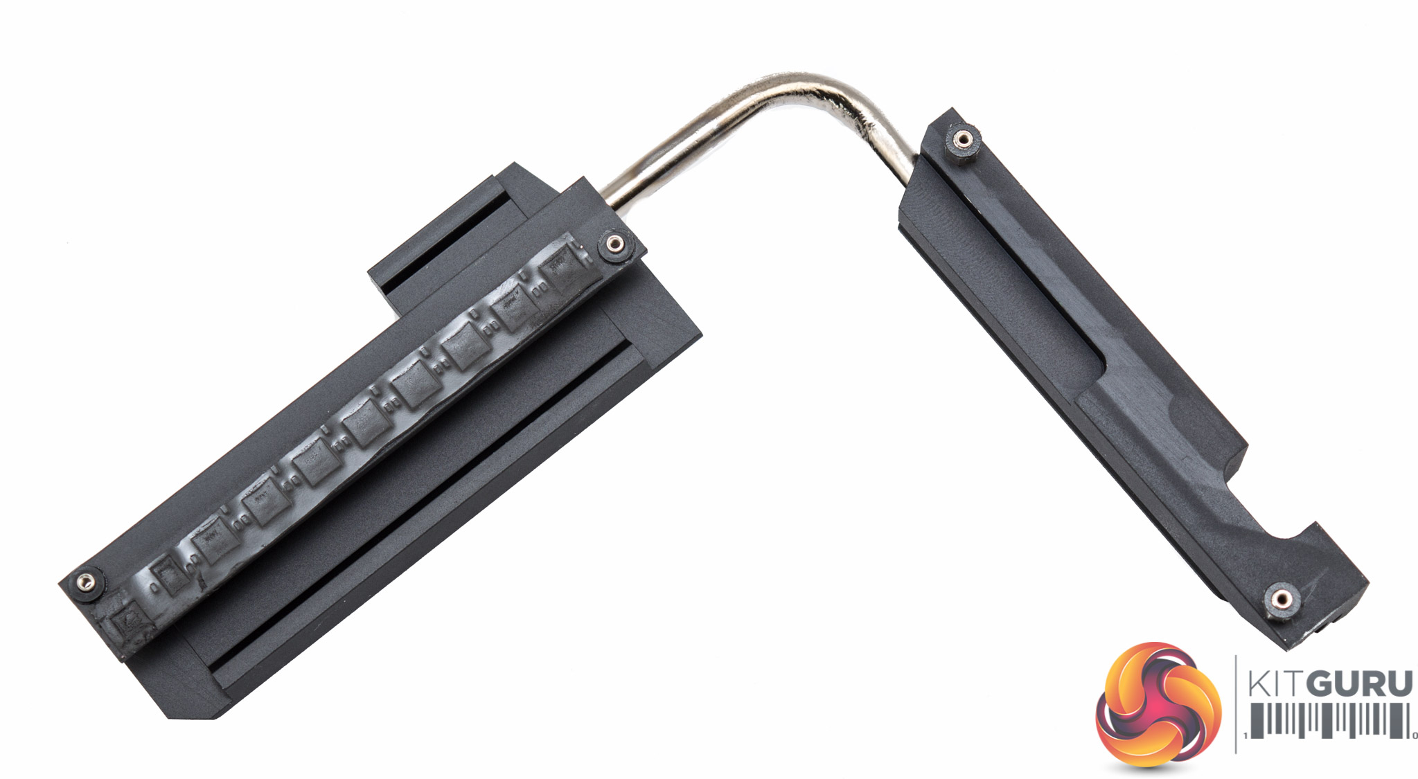 A real heat pipe based heatsink links the two CPU heatsinks together which should provide some added cooling capability to the CPU VRMs. The CPU appears to be powered by a 10-phase (8+1+1, VCore+VCCSA+IO) design and is linked to an Infineon IR35201 chip which can only drive up to 8 phases.