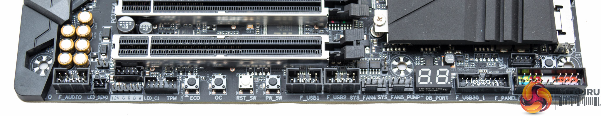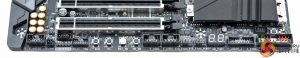 Following around the bottom edge is an ample selection of buttons – ECO, OC, Reset and Power as well as more USB, a debug code reader and 12v G R B W header. The ECO button is a fairly new addition which Gigabyte describes, along with the OC button, as follows: