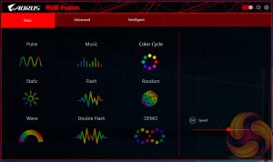 RGB Fusion is Gigabyte’s LED software that will let you individually manipulate each onboard RGB LED zone or connected LED strip. There are three tabs, basic, advanced and intelligent, which hold different levels of detail and options. The advanced tab will allow you to control each zone independently of the other zones while in the basic tab changes of colour and lighting pattern will be automatically applied to all controllable LEDs.