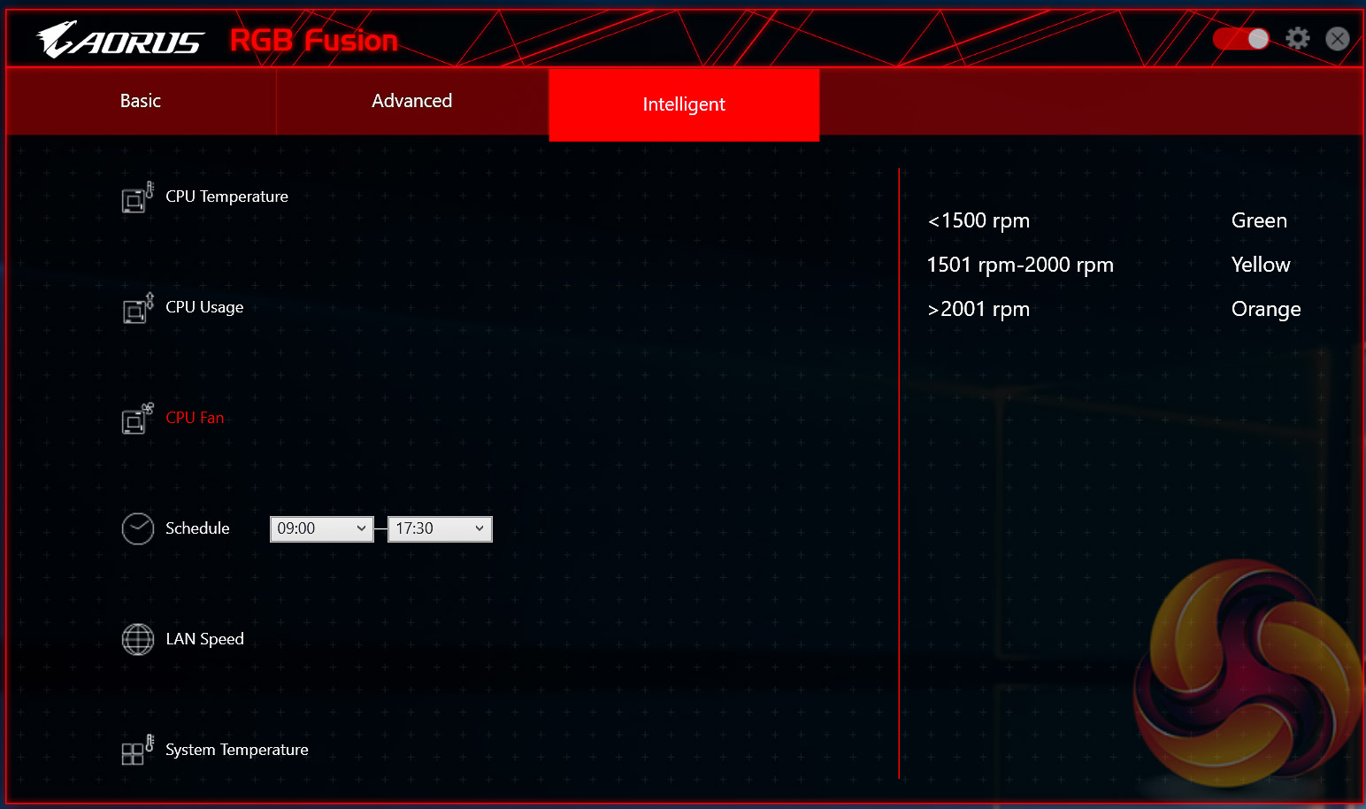 Intelligent is a new mode Gigabyte has added since Z270 launch that changes colour based on a number of system parameters such as fan speeds, CPU temperatures or even LAN speed.