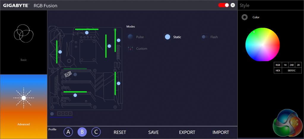RGB Fusion is Gigabyte's LED controlling software that will let you individually manipulate each onboard RGB LED or connected LED strip. There are two tabs, basic and advanced, which hold different levels of detail and options. The advanced tab will allow you to control each zone independently of the other zones while in the basic tab changes of colour and lighting pattern will be automatically applied to all controllable LEDs.